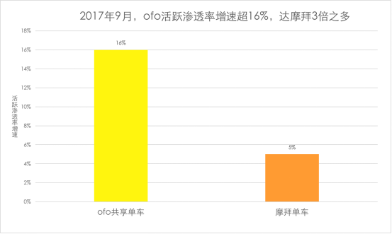 另外,QuestMobile数据还显示,在中国整个App市场活跃渗透率方面,ofo9月活跃渗透率为3.94%,环比增长近16%,位居共享单车行业第一;摩拜活跃渗透率为3.75%,环比增长5%,位居行业第二。数据对比可知,ofo的活跃渗透率增速是摩拜的3倍之多。同时,ofo9月的月活用户规模环比上涨16.5%,其活跃用户规模增速也是摩拜的3倍。