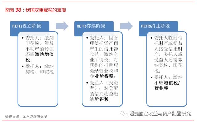 面临承担的税负水平不同。国外成熟市场 REITs 产品通常可以享受一定税收优惠。而在我国,在基础物业资产转移给 SPV(如私募基金和信托公司)时,由于所有权发生转移,根据现行法律原始权益人还需缴纳 25% 的企业所得税,如果原始权益人为房地产开发公司还另需按照累进税率缴纳 30-60% 的土地增值税,如在以后《公司法》允许的条件下通过公司制成立 REITs 公司,在 REITs 公司运营层面还需缴纳公司所得税,因此我国 REITs 所承受税负还处于比较高的水平。