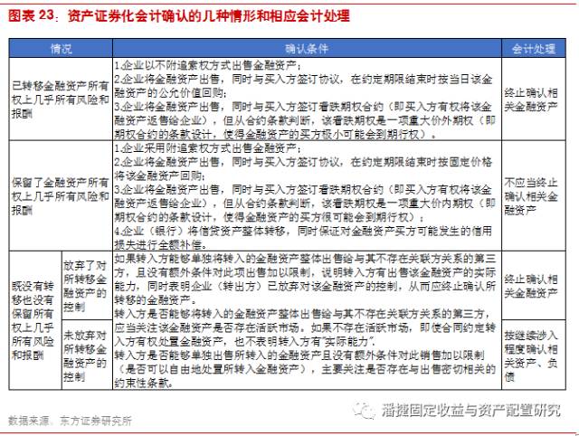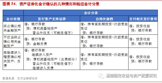 资产证券化发起人会计确认的关键是资产转移是视为销售还是担保融资,前者终止资产确认,实现出表;后者未能终止确认,后续计量与担保融资一致。对于证券化产品发起人的会计处理,依据证监会 2007 年的相关规定,公司应依据《企业会计准则第 23 号——金融资产转移》进行金融资产证券化的会计处理,非金融资产参照该文件。