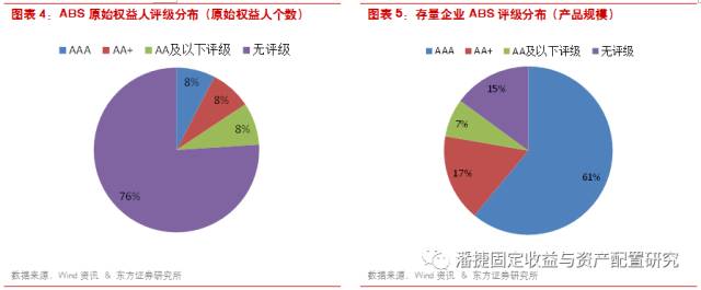 企业 ABS 产品设计过程中的破产隔离,使得产品债项评级与原始权益人评级分离,进而通过内外部增信措施大幅提高产品的最终评级。目前市场存量 ABS 的原始权益人中,主体评级 AA 及以下以及无评级的占比达到了 84%,而债项评级 AAA 和 AA+ 的占比达到了 78%。债项评级整体分布显著高于主体评级,ABS 的增信效果明显。