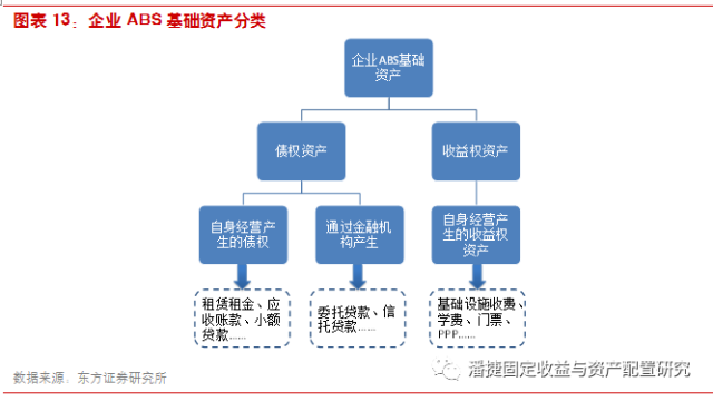 对于不同行业的企业 ABS 发行人,企业 ABS 的融资支持表现为不同的形式。基础资产可以分为债权和收益权两大类,分别为企业表内资产和预期将取得的资产。