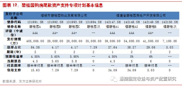 其中,增城市碧桂园物业发展有限公司共发行 48 亿元,主体评级为 AA+,发行人为银华财富资本管理(北京)有限公司。此单 ABS 中 2 年期优先 A 级、优先 B 级及优先 C 级的发行利率分别为 4.5%、5.65% 和 5.8%。福建省碧桂园房地产开发有限公司共发行 14.11 亿元,发行人为平安证券有限责任公司。其 1 年期优先 A 级份额、2 年期优先 A 级份额及 2 年期优先 B 级份额的发行利率分别为 4.5%、5.0% 及 6.0%。