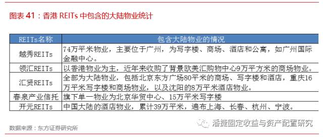 截至 2016 年 12 月 31 日,香港及新加坡共有 15 支 REITs 持有位于中国大陆的物业(共持有国内 67 处物业),其中新加坡 10 支,占全部上市 REITs 的 28%;香港有 5 支,即香港上市 REITs 中(共 10 支)有一半持有中国大陆物业。