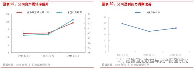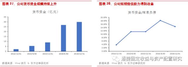 此后公司继续发行 ABS 融资。2015 年至 2017 年已发行六期资产支持证券和一期 ABN,共融资 65.1 亿元。公司货币资金规模持续上升,从 2014 年末的 2.28 亿攀升至 2016 年末的 29.93 亿元,短期偿债能力也明显提升,货币资金/有息负债的比值从 2014 年末的 3.78% 提升至 2016 年末的 14.63%。