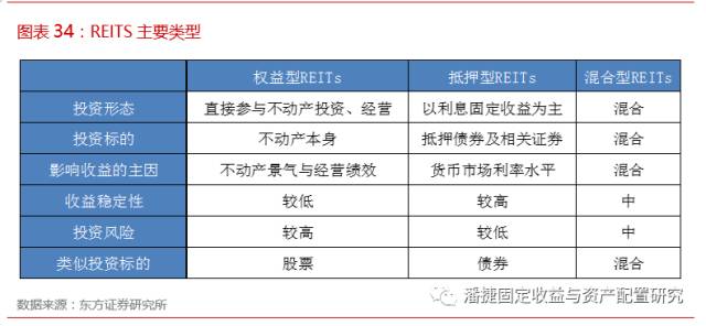 按照底层资产类型不同,REITs 可以分为权益型、抵押型和混合型。权益型 REITs 通过投资和运营房地产项目,获得房地产的产权以取得经营收入,投资者的收益来自租金和房地产的增值。抵押型 REITs 是以金融中介的角色将所募集的资金向房地产物业持有者提供贷款并购买债券。混合型 REITs是权益型和抵押型 REITs 的综合体,其自身拥有部分物业产权的同时也在从事抵押贷款的服务。