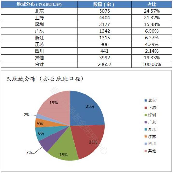 与此同时,私募汇APP数据显示,从办公地址分布来看,截至8月底,北京超过上海、深圳,成为私募办公地最集中的城市,数量达5075家,占比24.57%;上海、深圳分别是4404家、3177家,占比21.32%和15.38%,三地总占比超过六成,达61.27%,比注册地更加集中。