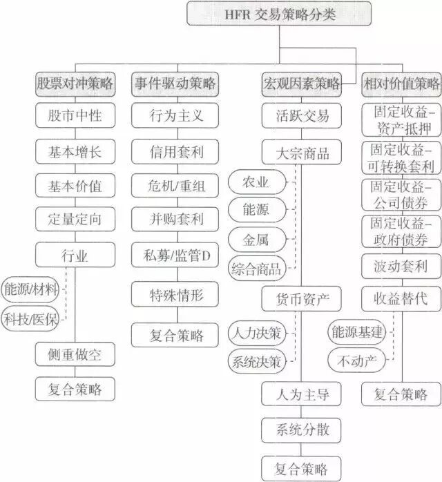 对冲基金研究公司 ( HFR) 推出了目前市场上较为权威的策略分类体系(见图8 -1) ,基本上囊括了市场中存在的所有交易策略或交易品种, 也反映了对冲基金产业的发展趋势。