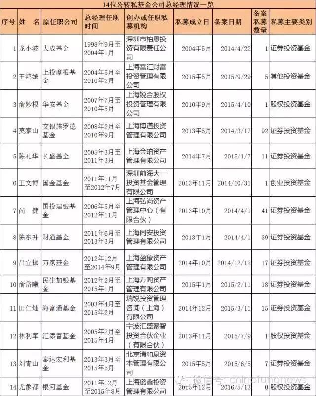 当然除了一哥一姐以外,公转私的基金经理越来越多,在基金业短暂的19年发展历史中,先后至少有14位总经理离职后最终选择创业私募,以实现自我价值。
