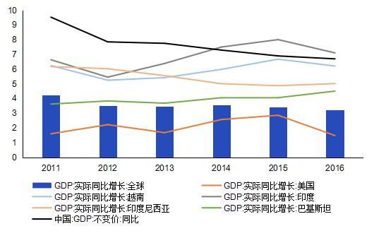 图表 1:亚太地区各国GDP增速明显高于世界平均水平